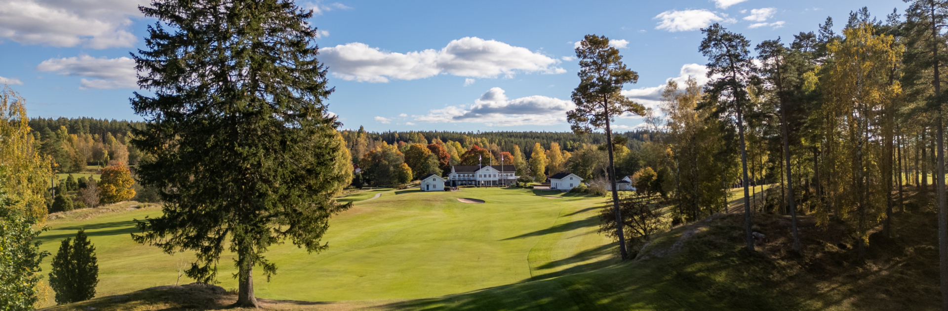 Klassiskt avslutningshål mot klubbhuset. Dold fairway. Säkerställ att framförvarande är utom räckhåll från tee. Markera sedan er position för bakomvarande. OBS! Inga golfbilar får köras över åsen, följ väg till vänster.
