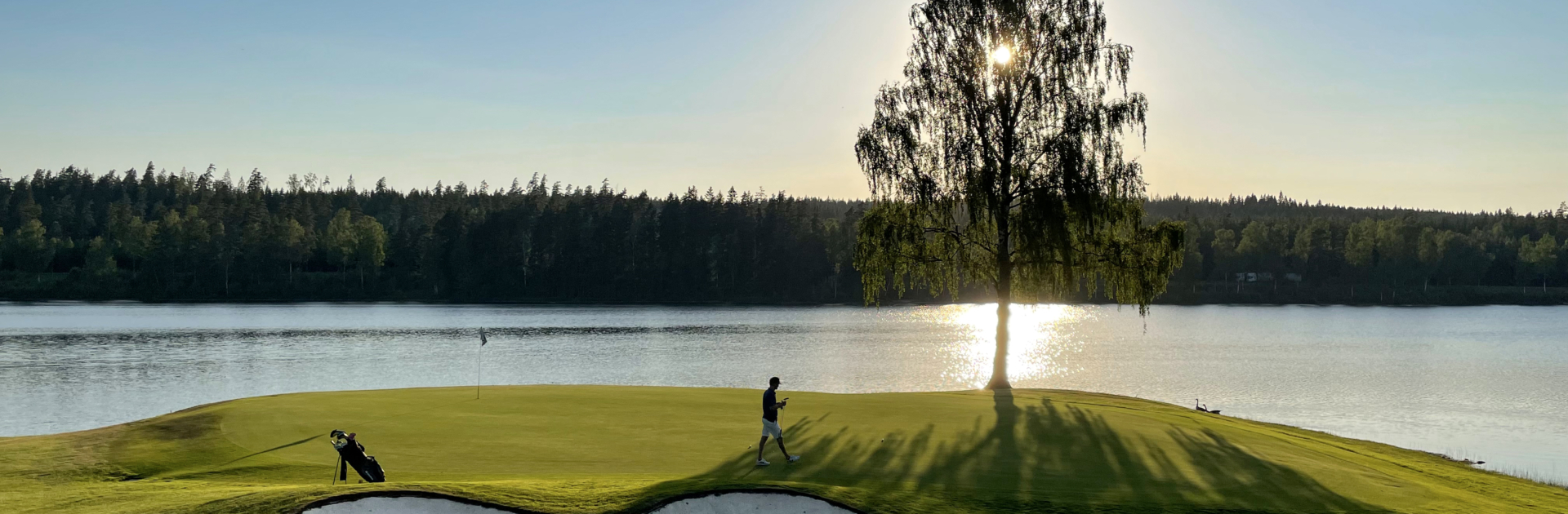 Njut av utsikten från den upphöjda teeboxen ner mot greenen som ligger på en halvö i Hammarsjön med Isabergstoppen i bakgrunden. Känn av vinden så att du gör rätt klubbval.
